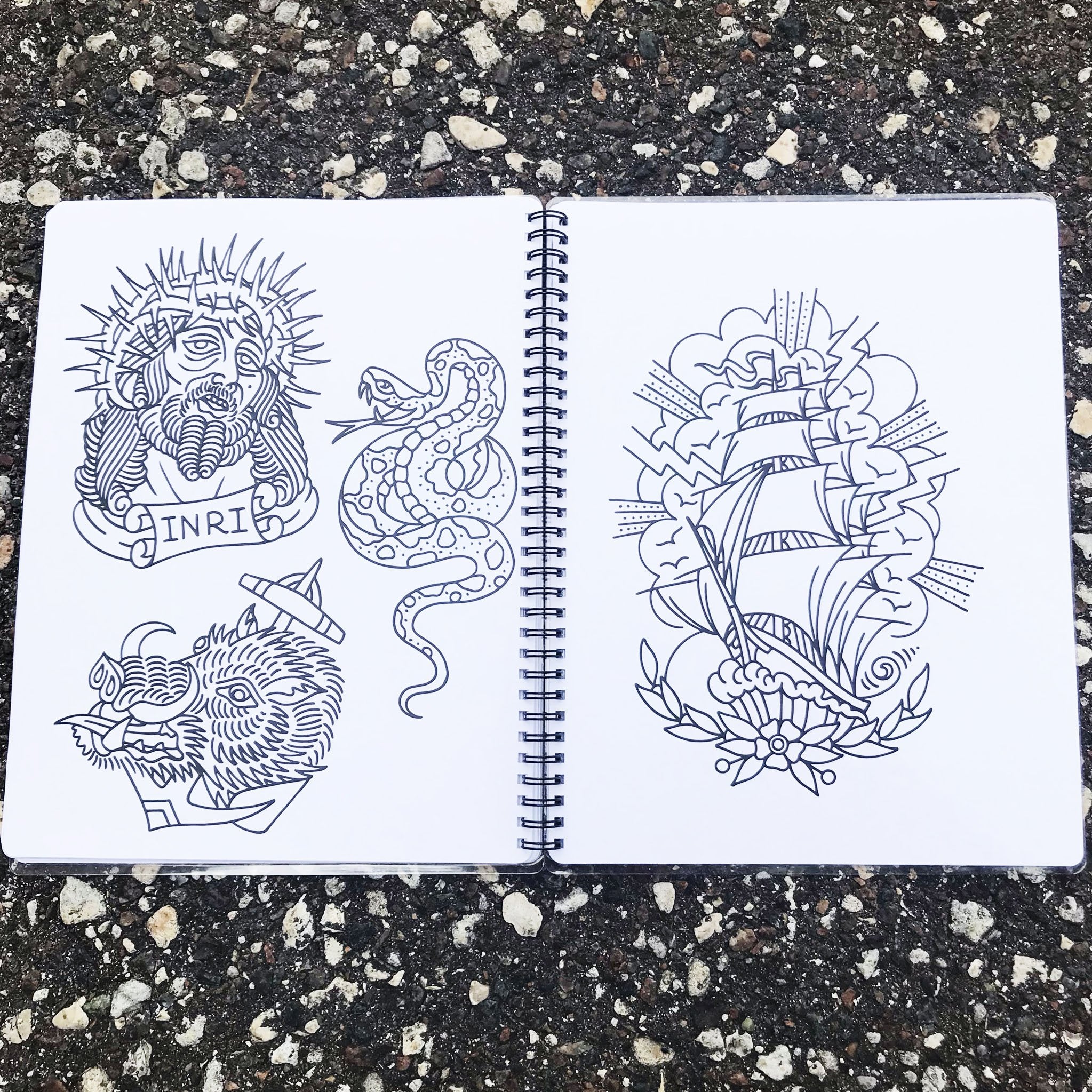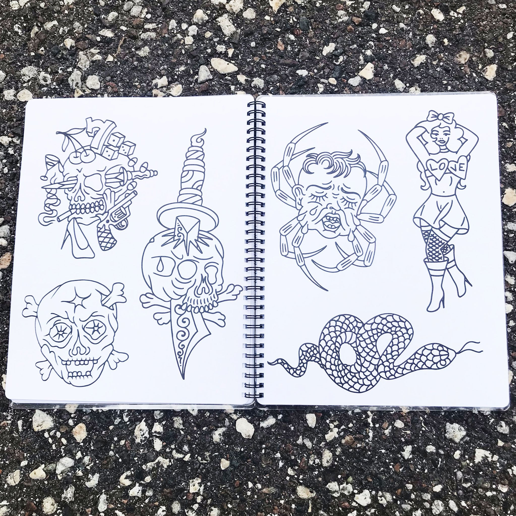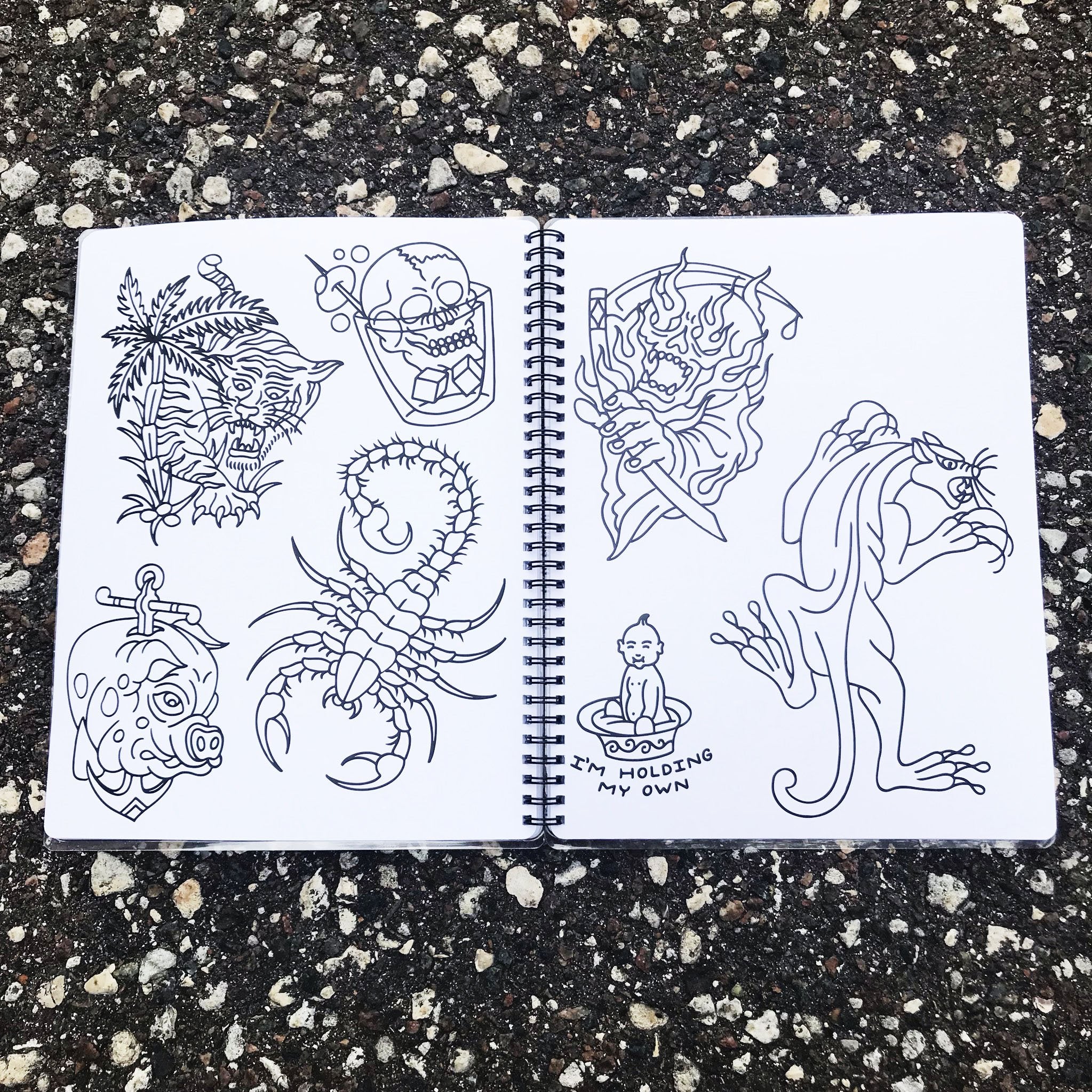 - 40 pages of original tattoo flash line drawing artwork by Mikey Holmes
